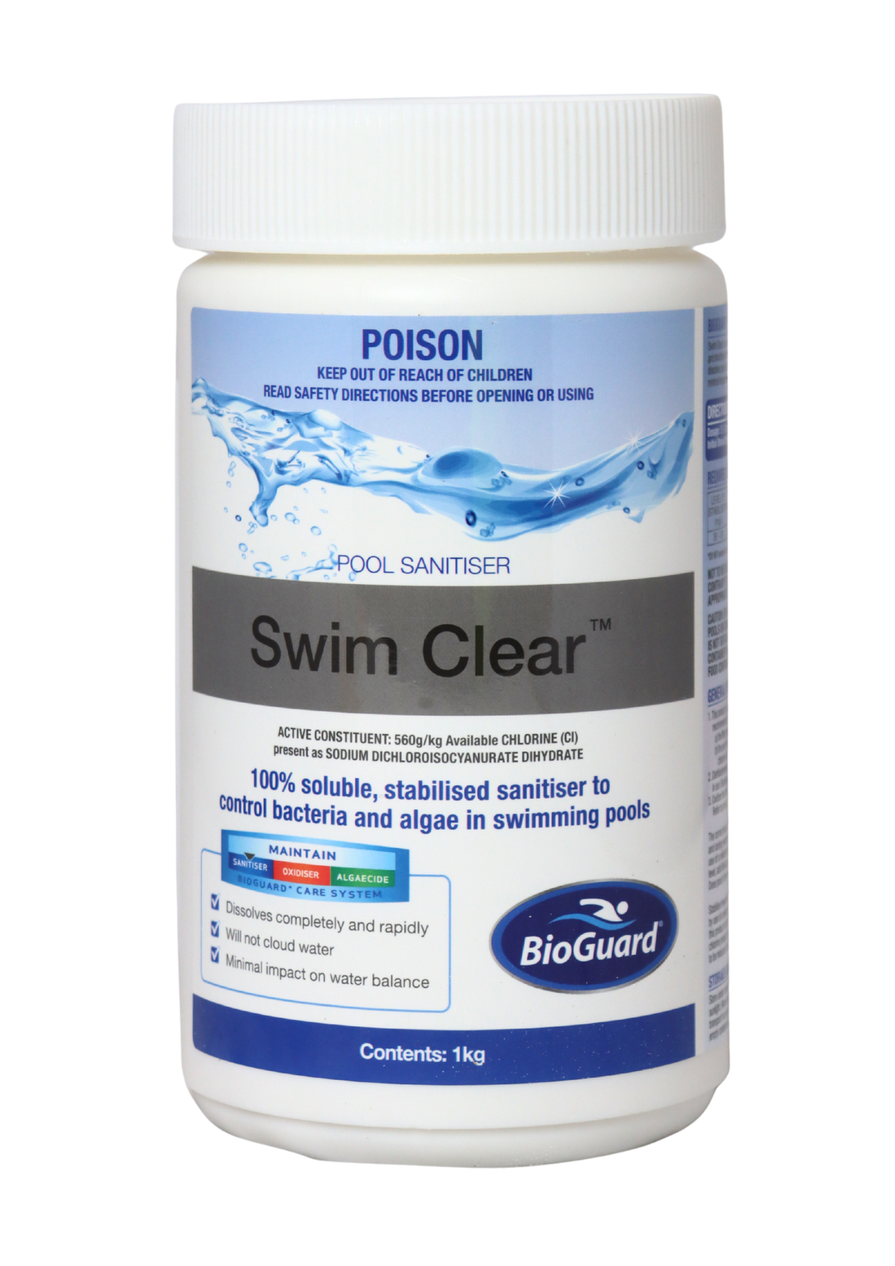 BioGuard Swim Clear is a completely soluble, stabilised granular chlorinating product suitable for both regular sanitation and shocking. Excellent for sanitising small above ground pools. Concentrated so you use less. Minimal impact on water balance, saving you money.